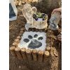 Oryginalny nagrobek dla psa w kształcie łapy z imieniem i datami.