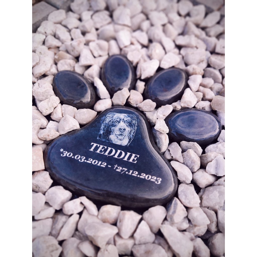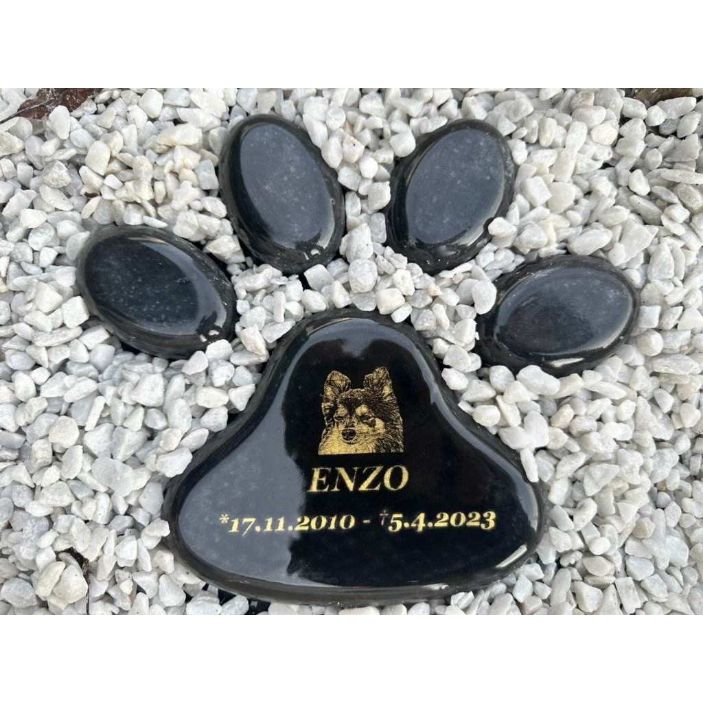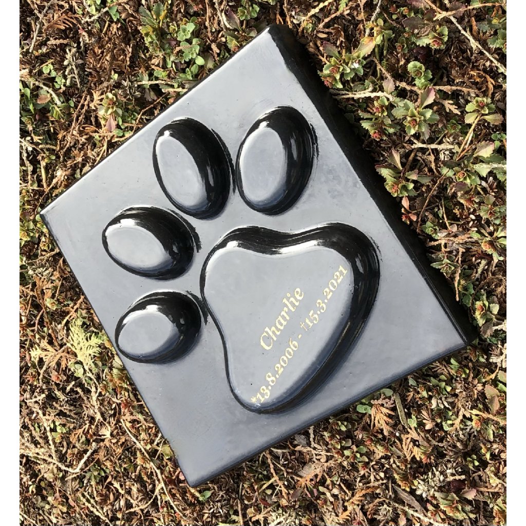 Betonowy nagrobek dla psa w kształcie czarnej łapy z grawerem i zdjęciem
